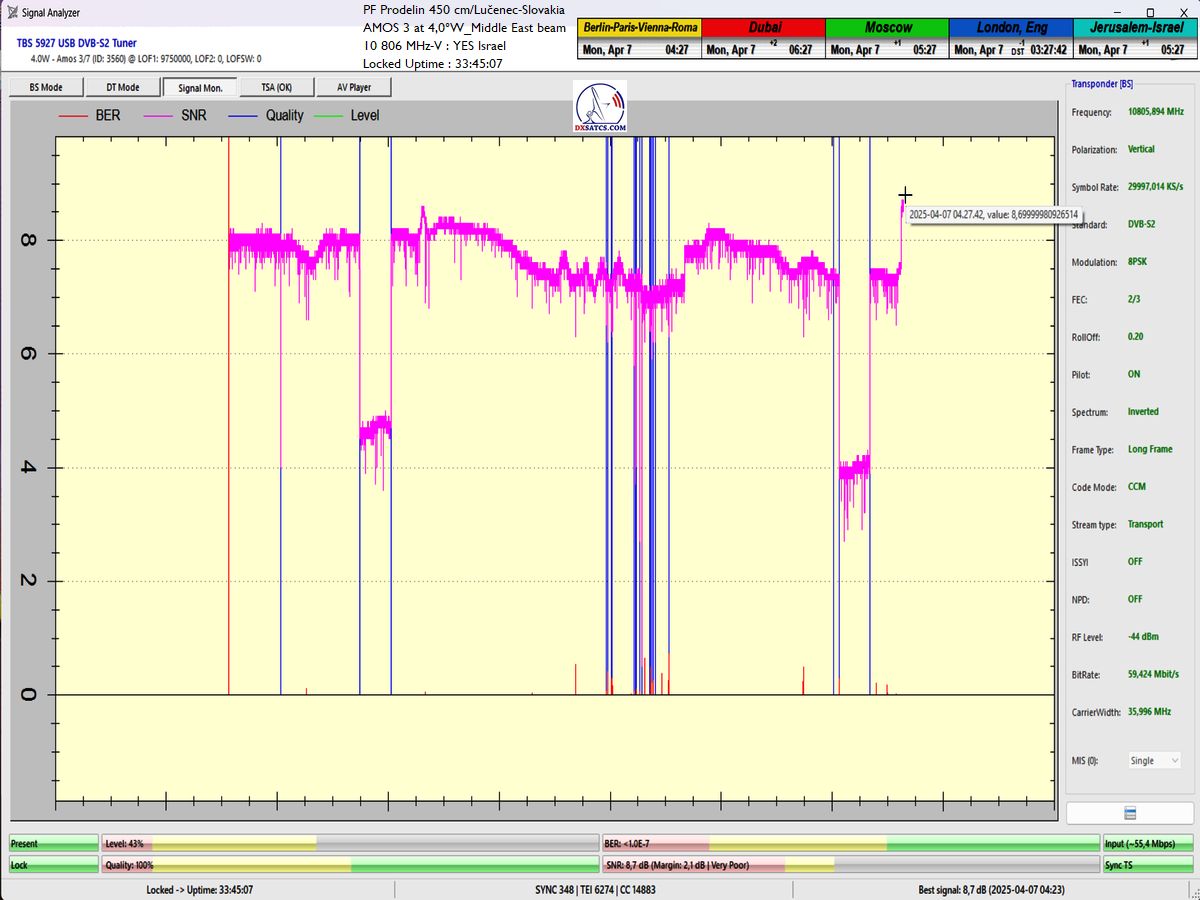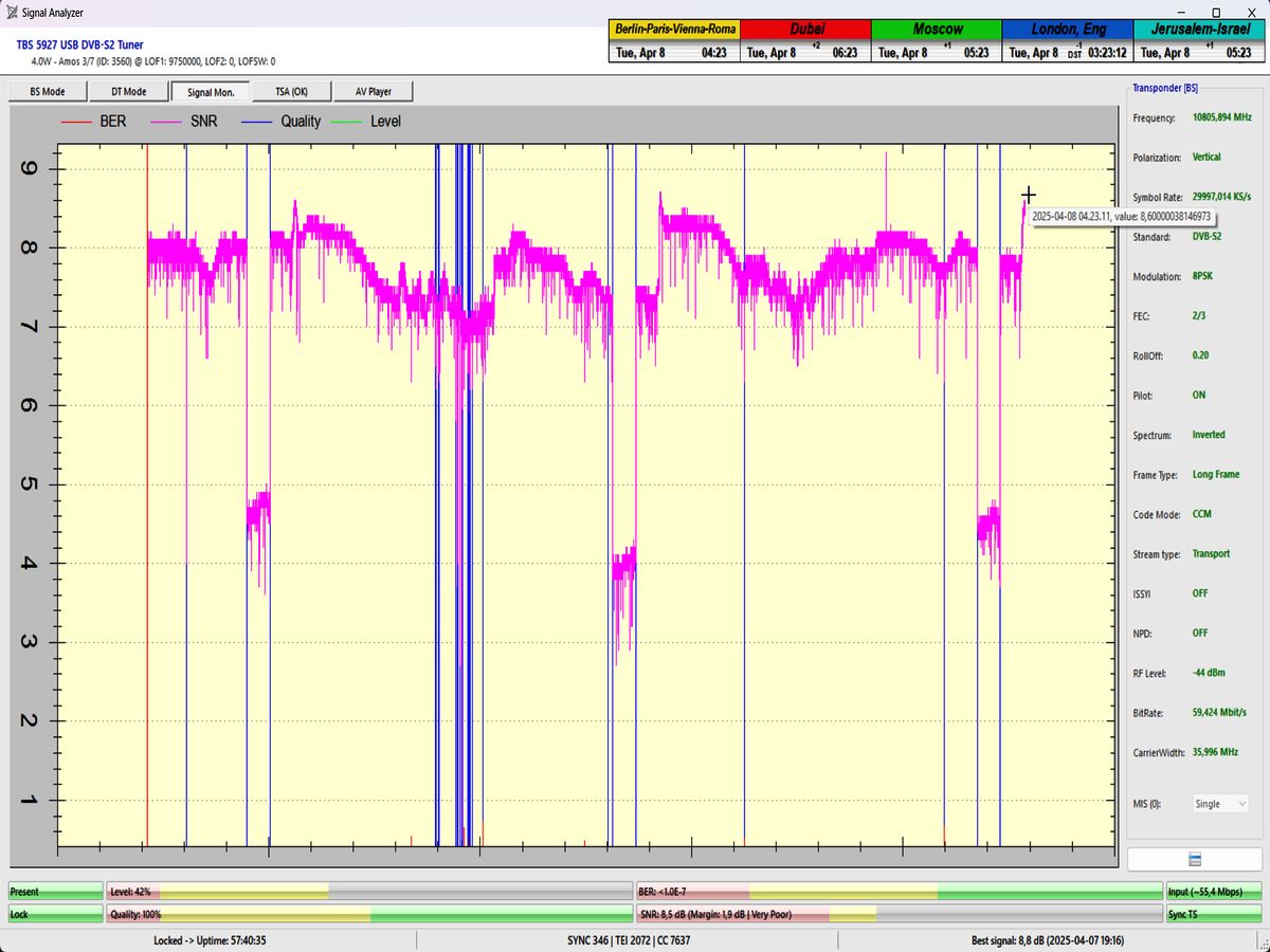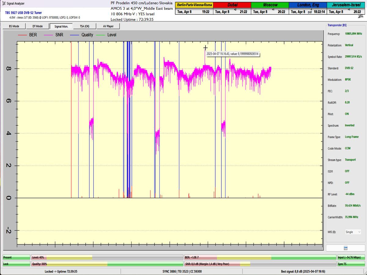 frequency f = 10,842 MHz_V I recorded an unprecedented signal quality, reaching an SNR level of 12,8 dB – still during the original modulation configuration
