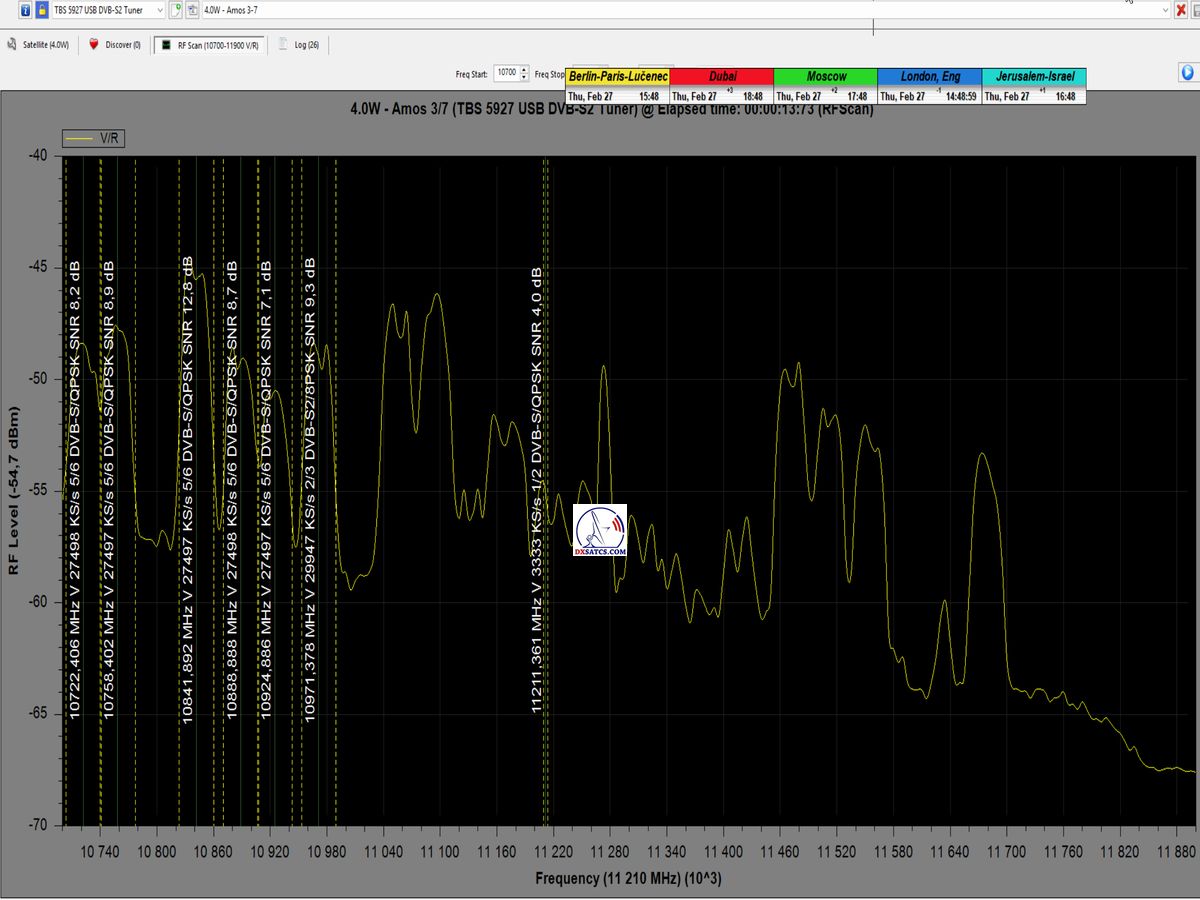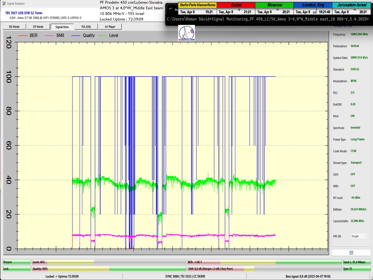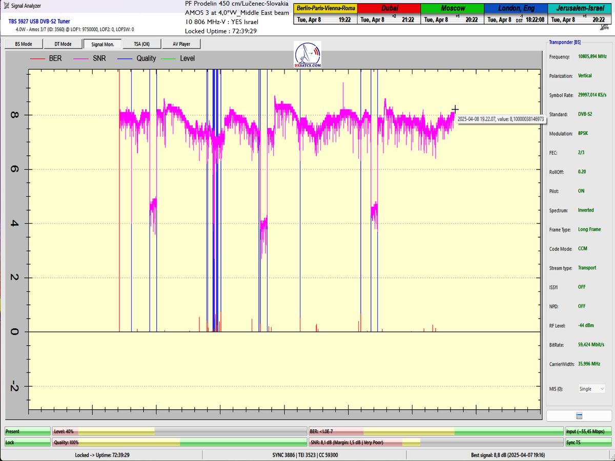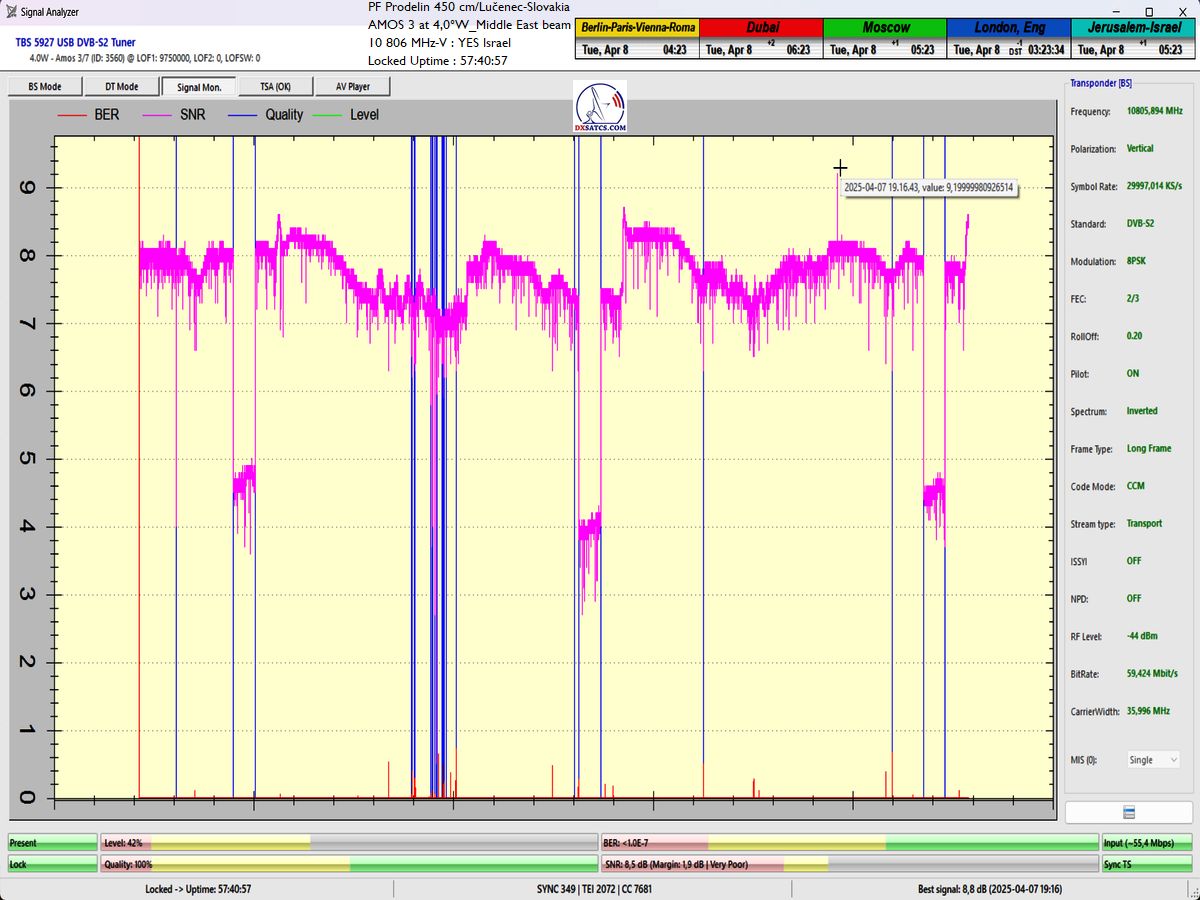 frequency f = 10,842 MHz_V I recorded an unprecedented signal quality, reaching an SNR level of 12,8 dB – still during the original modulation configuration