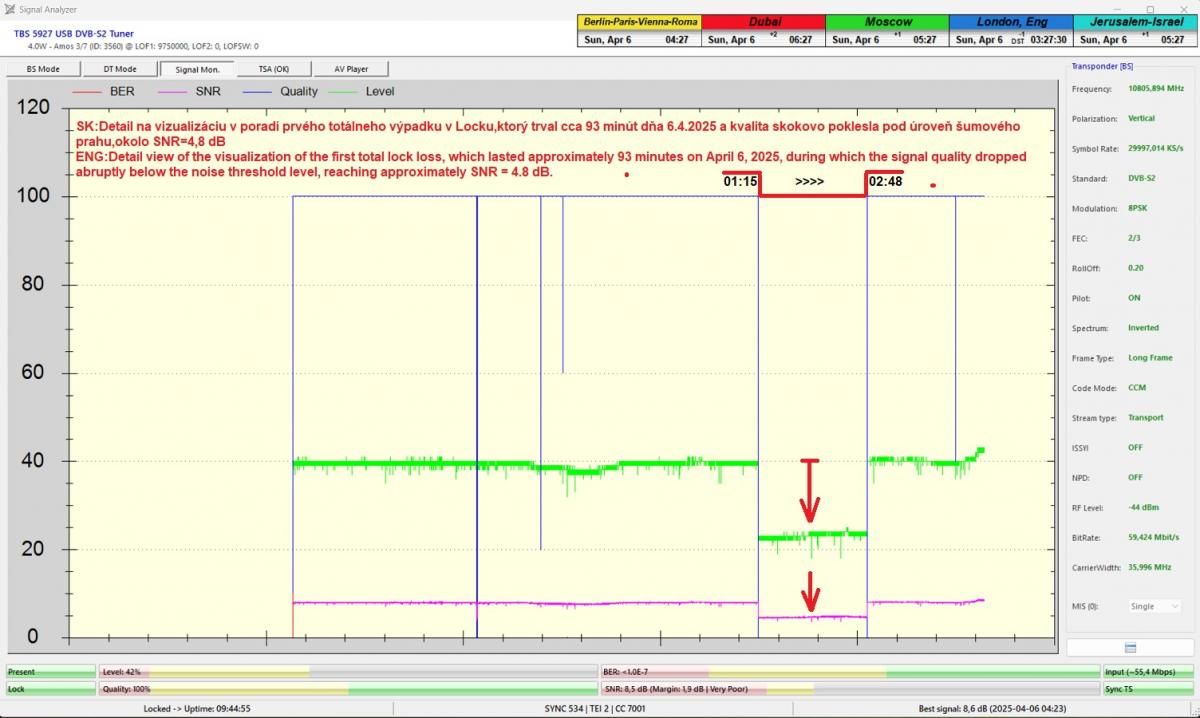 a klasifikujem stabilitu príjmu na 10 806 MHz aj bez započítania dĺžky výkonovej anomálie,ktorú som už odstránil v pondelok dňa 21.4.2025