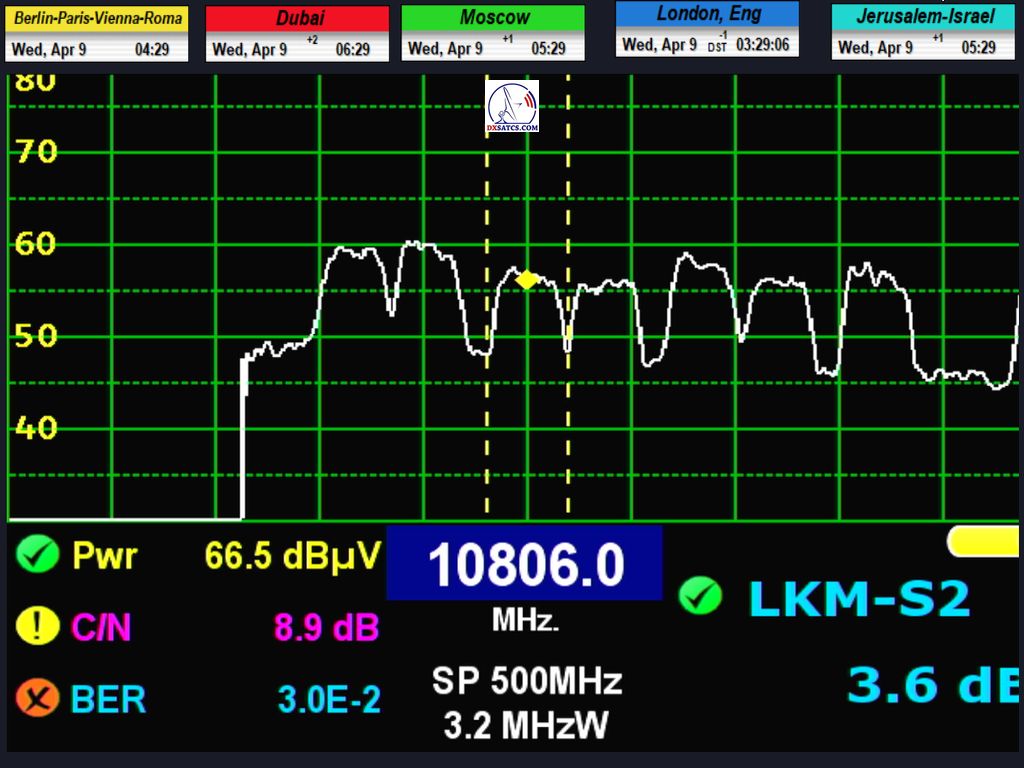 for satellite distribution on the frequency f = 10,842 MHz_V from the Amos 3 satellite at 4.0°W in the Middle East beam.