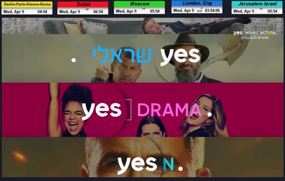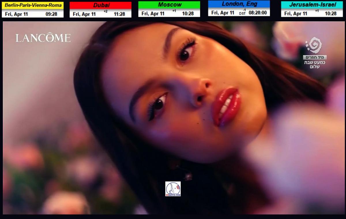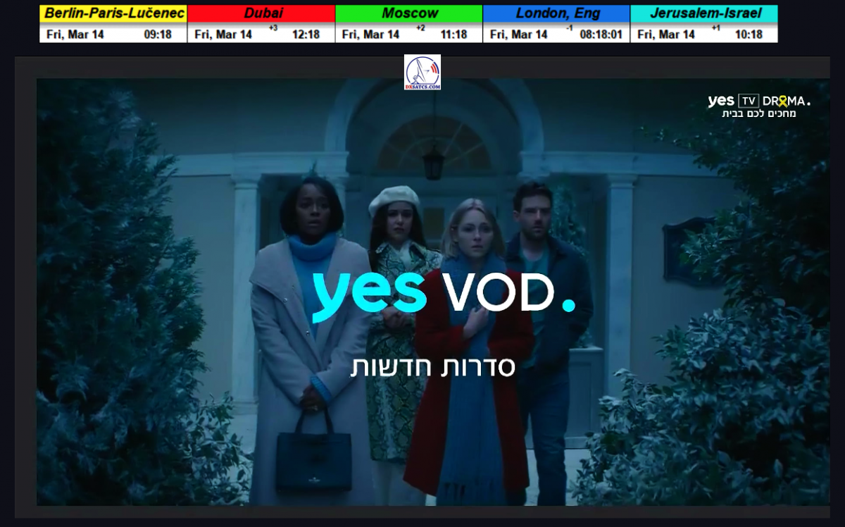Israeli provider YES, broadcast in DVB-S2/8PSK standard at F=10,806 MHz_V from the Amos 3 satellite at 4.0°W, within the Middle East radiation pattern at the