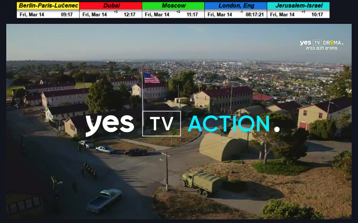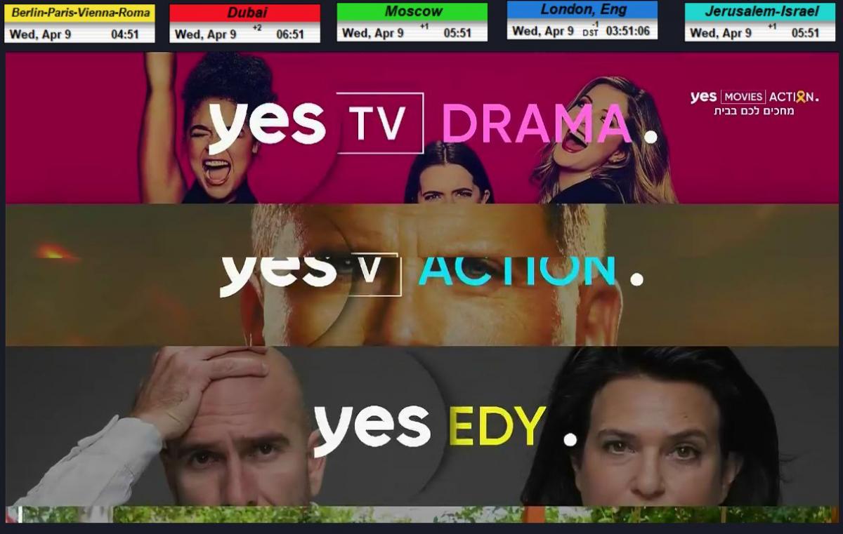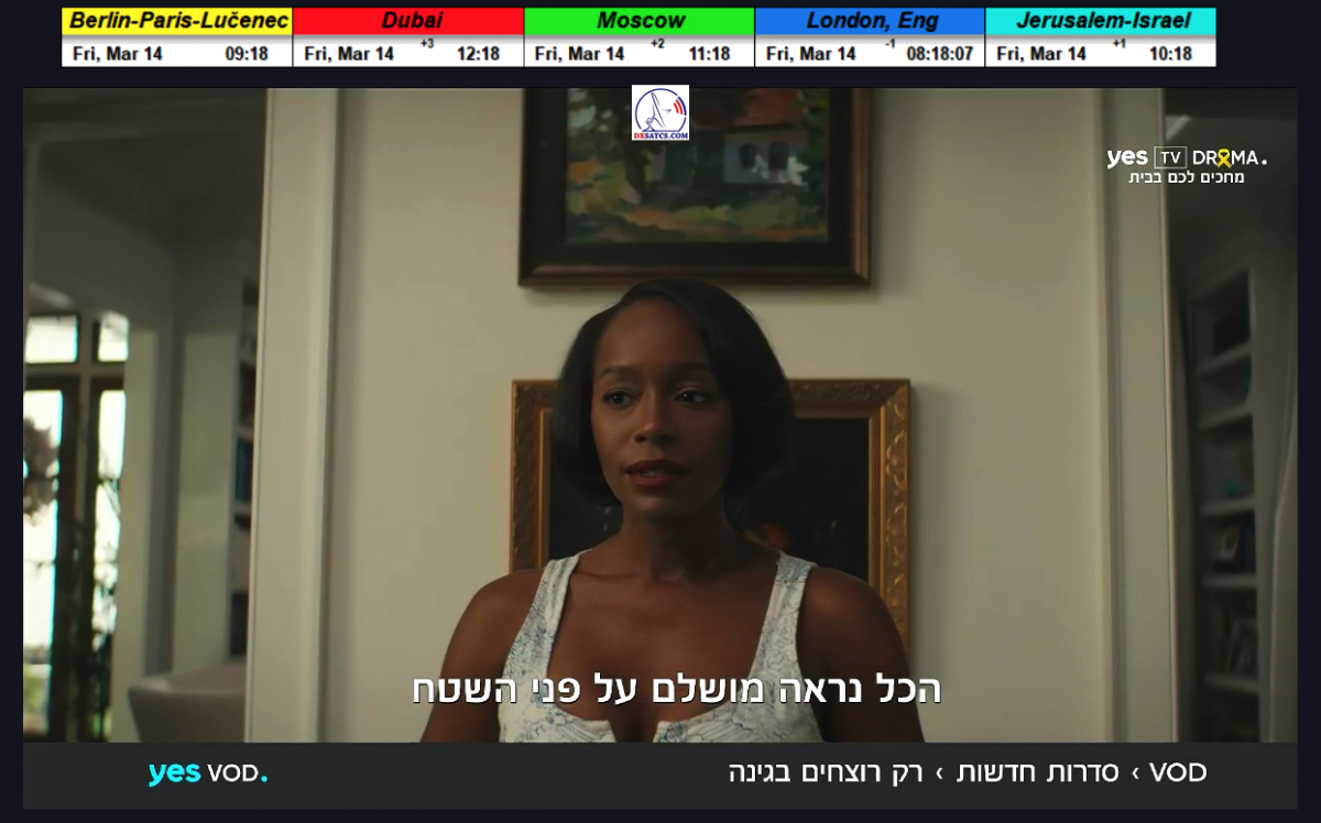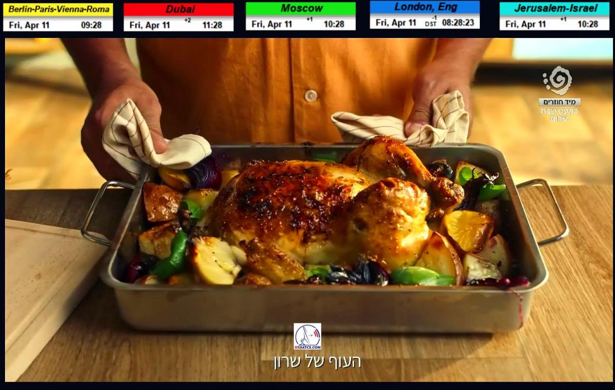 Israeli provider YES, broadcast in DVB-S2/8PSK standard at F=10,806 MHz_V from the Amos 3 satellite at 4.0°W, within the Middle East radiation pattern at the