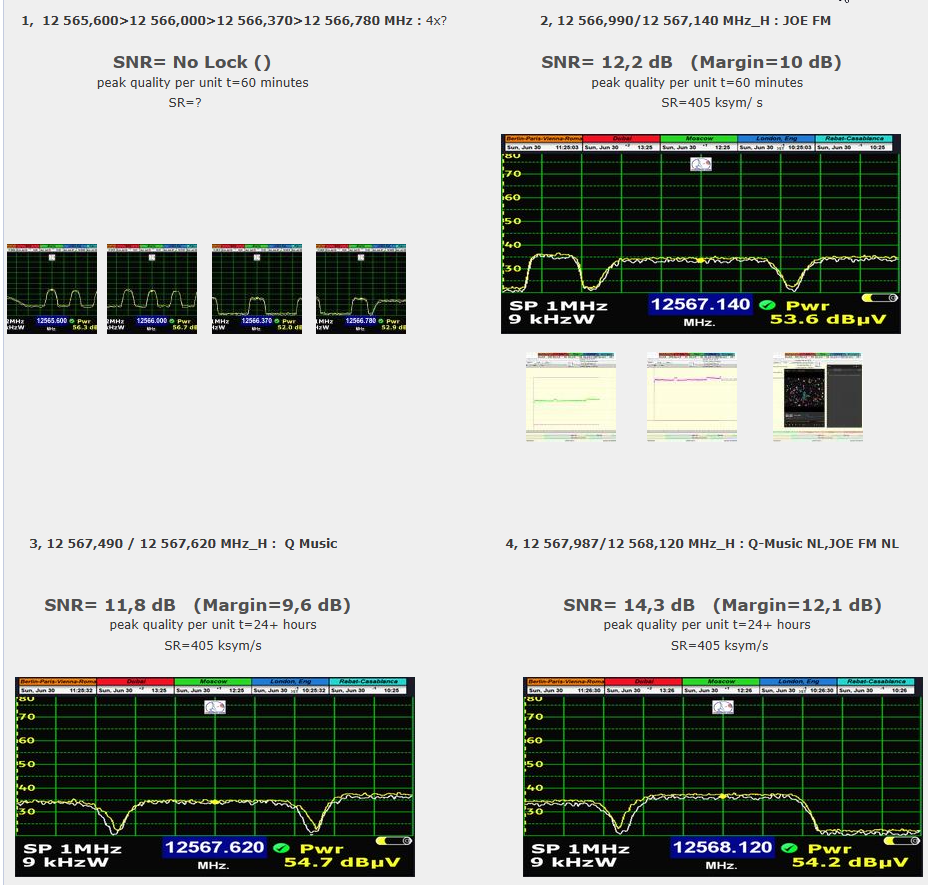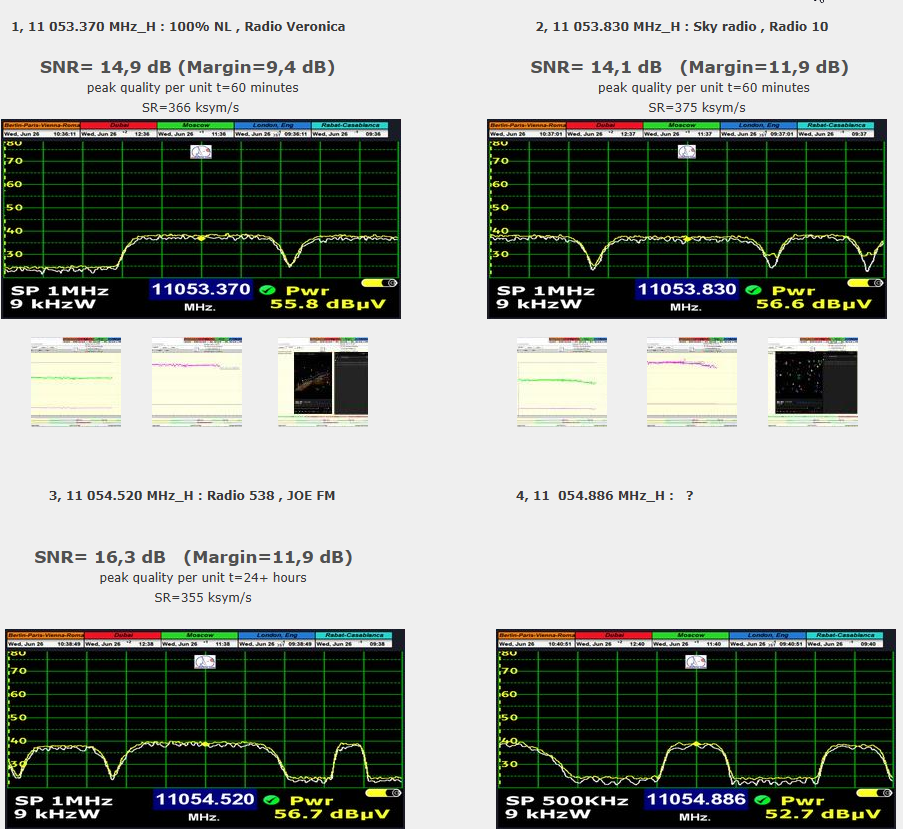 Im Frequenzspektrum des Transponders Nummer FU6 von 11 053.370 MHz bis 11 055.086 MHz_V, habe ich eine Quantifizierung seiner aktuellen Belegung durchgeführt,zusammen mit einer kontinuierlichen Signalüberwachung jeder Trägerfrequenz für eine Mindestdauer von 60 Minuten bis zu 75 Stunden.Dies umfasst eine detaillierte Analyse des heute untersuchten BNR Nieuwsradio mit einem Symbolratenparameter von SR=176 ksym/s bei f=11 054.170 MHz