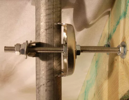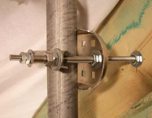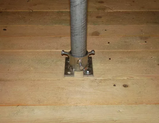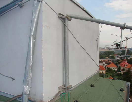 Kedže povodný stožiar bol nevyhovujuceho priemeru,bol po prepočtoch výška,priemer,počet antén,plocha doporučený iný typ.Samotný stožiar tvorí pozinkovaná hrubostenná trubka,ktoru je možné zakupit v špecializovaných predajniach.Kedže zo strany technika je a prevláda snaha priblížit sa aspon čiastočne k dokonalosti bola preto jednou z konštrukčných otázok aj otázka zakončenia danej trubky.Kedže prirodzenou vlastnostou plastu je jeho deformácia,bol práve preto tento sposob zavrhnutý.Na trubku bol preto pomocou závitorezu zrealizovaný závit.Podla daného priemeru bola zakupená kovová zn.násadka s vnutornym závitom príslušného priemeru,ktorá bola následne v smere závitu zafixovaná.Vzhladom ku materiálu krytiny,plech bolo potrebné previest ešte pred samotnou inštálaciou stožiara upravu pre prechod jednotlivých zvodov,ktoré prechádzaju jeho vnutornou častou.Uprava bola prevedená vyrezaním otvoru pre vývody zvodov v spodnej časti a výrezom elipsovitého tvaru v hornej časti pre vstup.Ochrana pred zatekaním prevedená tzv.smyčkou,no i napriek tomu zo zvyškov krytiny vyhotovená krytka fixovaná pomocou dvoch skrutiek.Samotné zrealizovanie fixácie stožiara prevedené pomocou komponentu zvaného ako mechanika,príp.držiak ant.rahna vid detail mechaniky.Pomocou týchto mechaník v kombinácii so závitovými tyčami,podložkami a maticami daného priemeru v tomto príp.10 mm bolo možné daný stožiar vyregulovat a zaistit do kolmej polohy.Je potrebné upresnit a dodat,že pri tomto druhu práce je predcíznost na mieste,kedže rozne nepresnosti Vám možu znehodnotit a ztažit všetky ukony napr.velké otvory,vzájomná vzd.vrtov,kolmost pri vrtaní atd.
