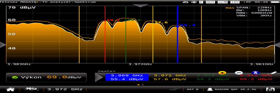 Zároveň popíšem stav v praxi, pri ktorom analyzátor Televes Mosaiq6 jednoducho nedokáže vykonať zamknutie ani jednej TV nosnej z troch stabilne prítomných nosných v rozsahu frekvencií 3 969 – 3 971 – 3 973 MHz, pretože – a tým sa dostávam k podstate problému – tento prístroj nedisponuje možnosťou manuálneho zadávania hodnoty symbolovej rýchlosti (SR).