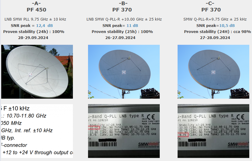 ►Klasifikácia dosiahnutých výsledkov na f=11 604,300 MHz: PF 450 cm_ V dostatočne dlhej jednotke jedného kontinuálneho monitoringu t=96 hodín som dokázateľne dosiahol stabilný príjem na 100% bez jediného výpadku v spojitosti priebehu funkcie pri minimálnom odstupe C/N=9,4 dB a špičke kvality SNR=12,3 dB a to všetko pri nevyhnutnej nutnosti aplikácie Technologického vynálezu "Synchrónne nanokorekcie" od autora Romana Dávida do systému,ktorá pozostávala z prípravy a vytvorenia Signálneho modelu a jeho následnej presnej replikácie do parametrov anténneho systému Prodelin 450 cm.Ako to následne dokážem presná replikácia vytvoreného signálneho modelu do anténneho systému generuje okamžitý rast signálnej kvality v tomto prípade od 0,5 do 0,7 dB/SNR,a posilňuje tým odolnosť signálneho reťazca pred výpadkom v kontinuite Locku nosnej s relatívne nízkou veľkosťou signálnej rezervy od 2 do 3 dB.Celkovú stabilitu na 100% som dosiahol aj napriek výrazne zhoršeným poveternostným podmienkam od 2 do 3.10.2024_pozri dáta z shmu.sk