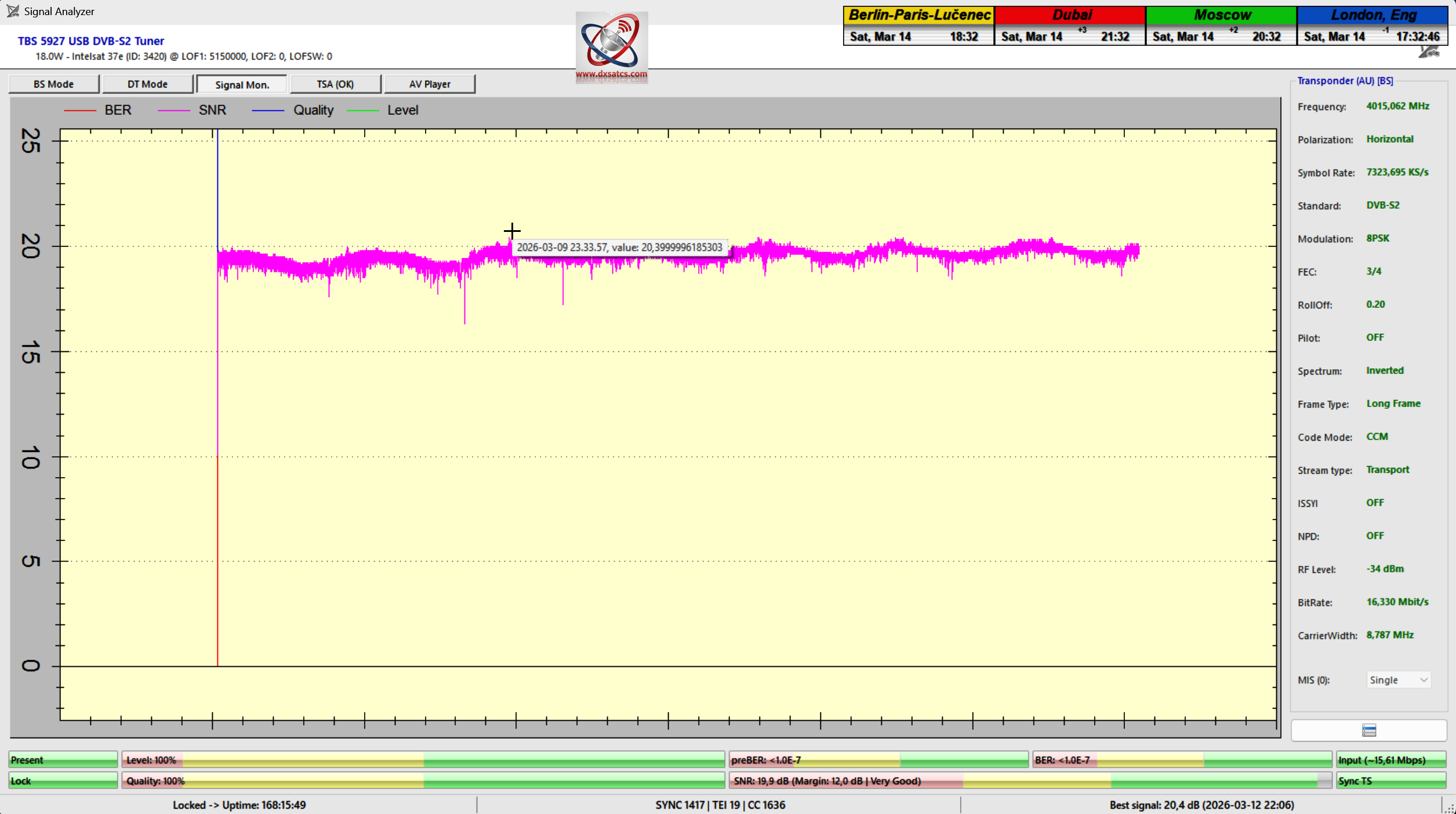 A single continuous, uninterrupted signal-monitoring session on the carrier frequency of ORTM MALI (f = 4,014 MHz_L), transmitted in the T2-MI/PLP technological standard, with a high degree of validation reliability, or probative weight, lasting t = 168 hours, which corresponds to 1 week, hereby verifies that I have demonstrably, and not accidentally, achieved an ideal or exemplary C-band reception quality state, with a record-high quality peak derived from a signal-to-noise ratio of SNR = 20.4 dB.