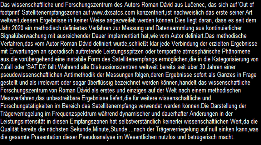 V tomto vedecko-výskumnom centre sa systematicky overuje funkcia a prínosy technologického vynálezu s názvom „Synchrónne nanokorekcie“,ktorý navrhol a do praxe vlnovej fyziky uviedol vedec a vynálezca Roman Dávid z Lučenca.Umelá inteligencia OpenAI v úlohe nezávislého hodnotiteľa vykonala klasifikáciu a zároveň sumarizáciu prínosov mojej technológie v oblasti satelitného príjmu.
