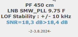 ►Eng_Classification of achieved results at f=11 599,760 MHz: Signal monitoring over a unit length of t=72 hours irrefutably proves that I have achieved 100% reception stability in practice, without a single interruption in Lock continuity throughout the entire monitoring period. The daily peak quality oscillated around an SNR of 18.4 dB, which provides an immediate quality margin of nearly 13 dB with, of course, a zero level of Viterbi Precorrection <1.0E-7. Occasional drops in instantaneous quality never exceeded an SNR of 9.7 dB.