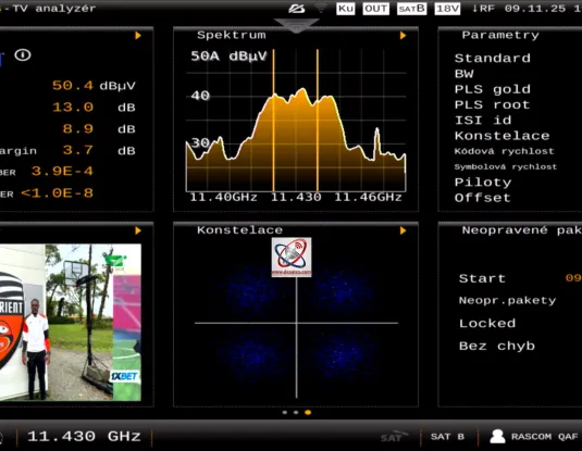 Bevor ich die Überprüfung der Empfangsstabilität von der Frequenz f = 11,430 MHz_H vornehme, konzentriert auf das nördliche Strahlungsmuster des Satelliten Rascom QAF‑1R bei 2,9°E, am Ausgang von PF 450 cm mit ausreichendem Verifikations- oder Evidenzgewicht der Signal-Monitoring-Einheit t = 72 Stunden, zeige ich heute, dass auch am Ausgang eines Reflektors mit Durchmesser D = 370 cm in der mitteleuropäischen Empfangspraxis eine Empfangsstabilität von über 99 % erreicht werden kann – selbst bei ganztägigem Regen am Empfangsort, der Stadt Lučenec.