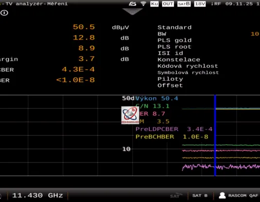 SK_Televes Mosaiq-6_11 430 MHz_H : analýza frekvenčného spektra,kvality,transportného streamu TS zaznamenaná dnes 12.11.2025.Tu je dôkaz že satelitná signálna distribúcia cez nosnú frekvenciu 10 870 MHz-H už bola ukončená