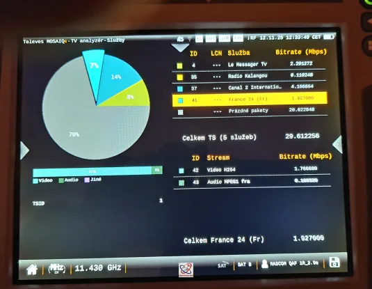 Dnes, 12. 11. 2025 o 11:00 CET, je obsadenie transportného streamu identické, alebo rovnaké so stavom zo dňa 9. 11. 2025, keď som vykonával zber nameraných údajov z frekvenčného spektra pomocou nového referenčného analyzátora spektra a kvality na dxsatcs.com, ktorým je Televes Mosaiq-6 s opciou 4K-UHD. To znamená, že dnes publikované dáta o stave v transportnom streame alebo v PAT mriežke na frekvencii f = 11 430 MHz_H sú tie najaktuálnejšie vôbec.