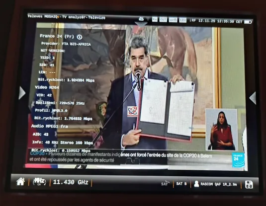 The operator Rascom, just before the last weekend, supplemented the transport stream on the carrier frequency f = 11.430 MHz_H with TV Canal 2 International in full HD resolution 1920 × 1080 and with the news-channel France 24 (Fr) in SD resolution 720 × 576, so that currently the TS includes two TV transmissions in full HDTV resolution, one in SD resolution and one radio transmission Radio Kalangou. That is the state as of today 12 Nov 2025 at 11:00 CET.