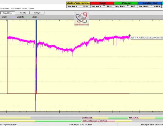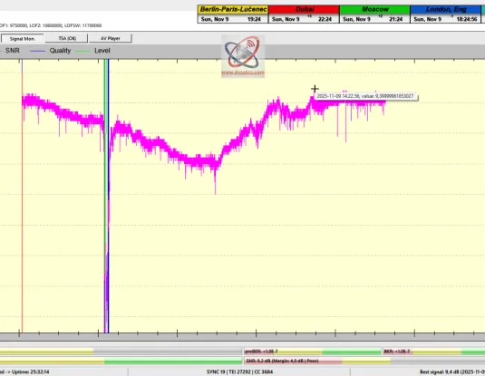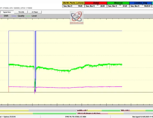 DE_Ich führte das erste Signal-Monitoring der Frequenz f = 11,430 MHz_H am Ausgang eines Prodelin-Reflektors mit 370 cm in der mitteleuropäischen Zone durch und erzielte eine Empfangsstabilität von 99,41 %, mit einer Spitzenqualität von SNR = 9,4 dB und CN = 13,0 dB.